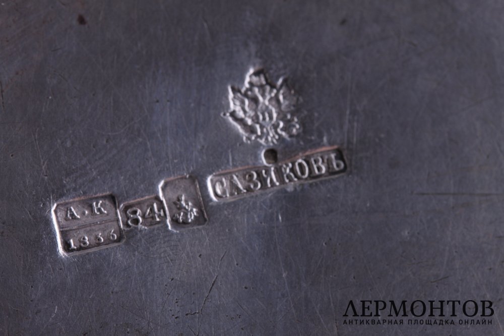Обращаем ваше внимание на то, что изделие выполнено из серебра 84 пробы, о чем свидетельствуют клейма и экспертная оценка. Клейма: пробирное клеймо Москвы - "Всадник с копьем"; указание года "1856"; цифровое обозначение пробы "84"; развернутое клеймо мастерской "САЗИКОВ" под двуглавым орлом - знаком придворого поставщика.