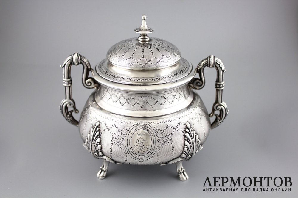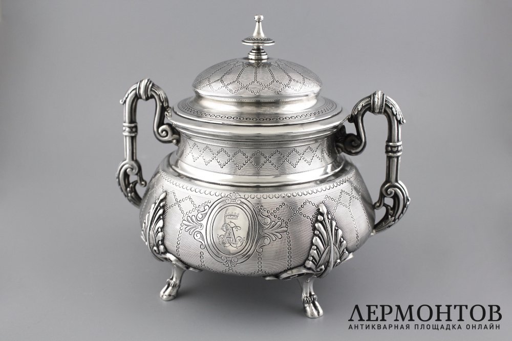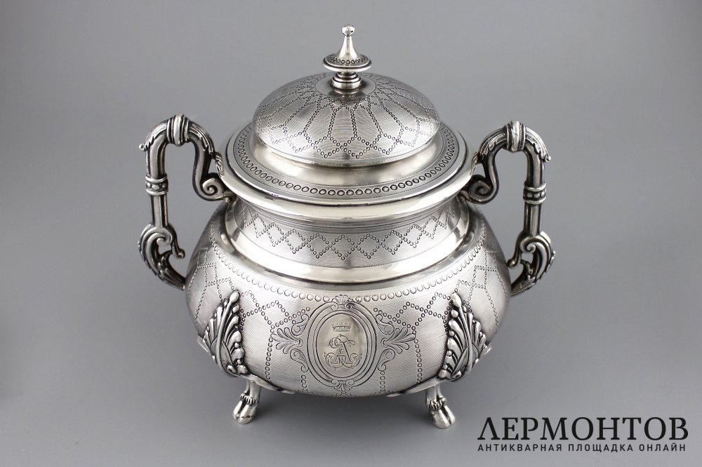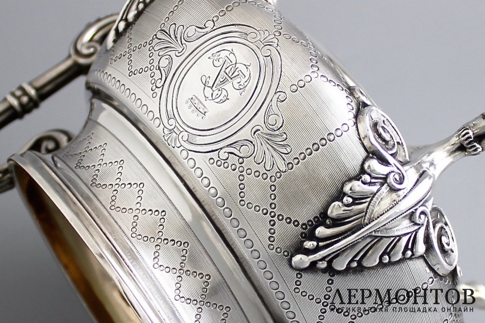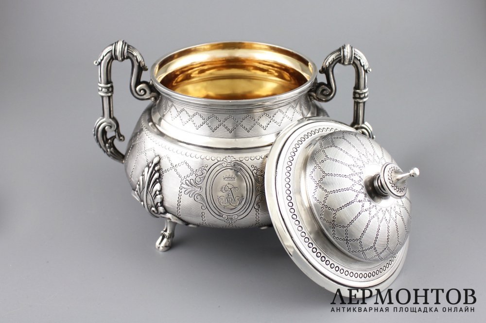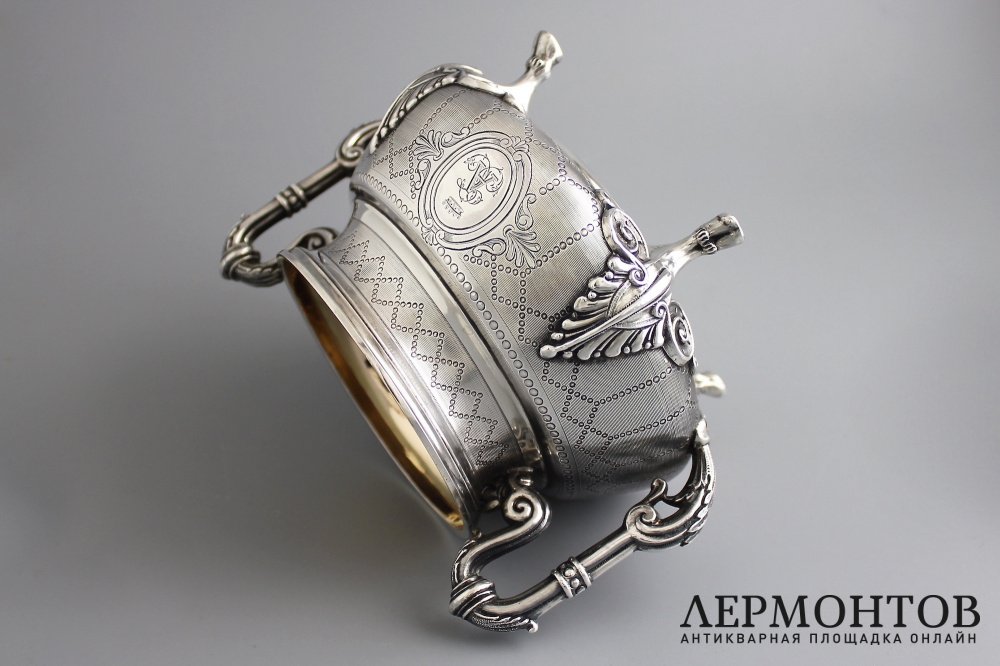 Серебро 950 пробы, гильоширование, золочение. На картуше - геральдическая корона.
