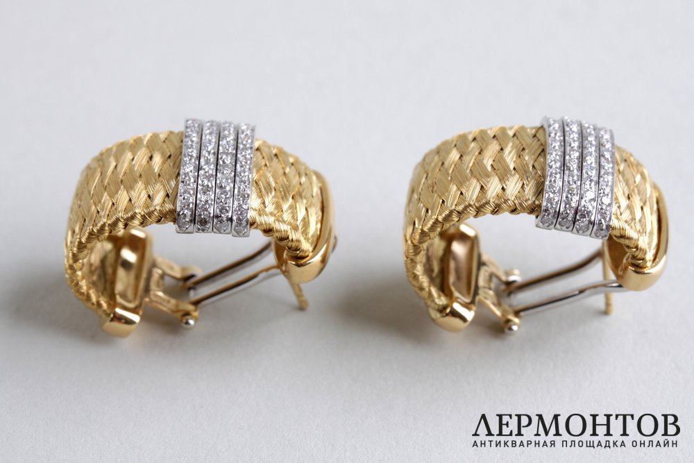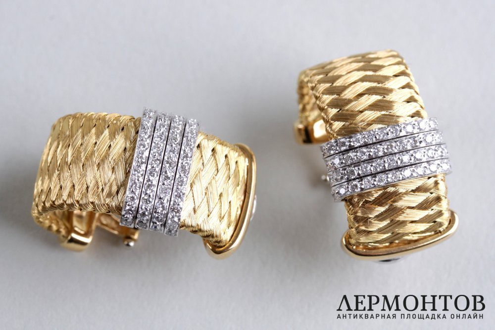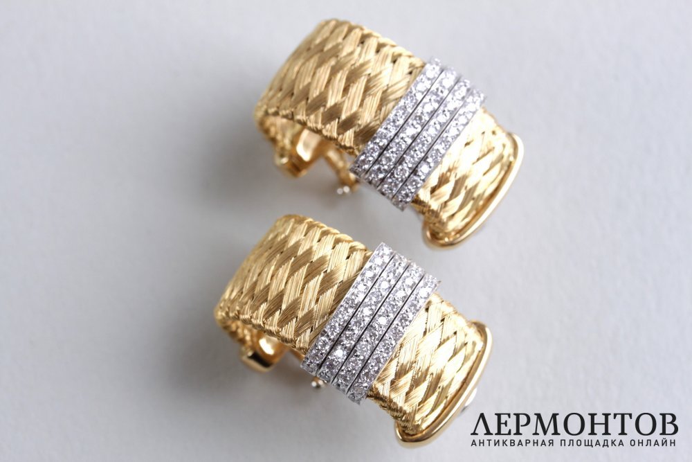 Серьги из желтого и белого золота 18 каратной (750) пробы, изготовлены известным ювелирным домом Роберто Коин в Италии. Плетение золота выполнено в тканном стиле. Украшены полоской из россыпи бриллиантов. Надежная застежка - итальянский замок "Омега".