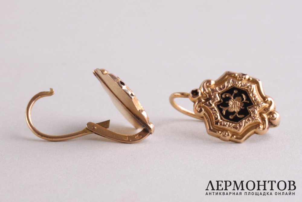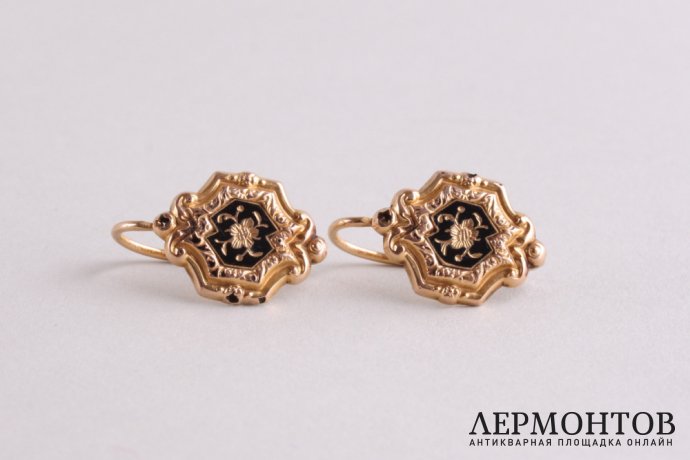 Антикварные серьги, изготовленные во Франции в Париже в середине XIX века. Выполнены из золота 750 пробы, украшены черневым эмалевым узором.