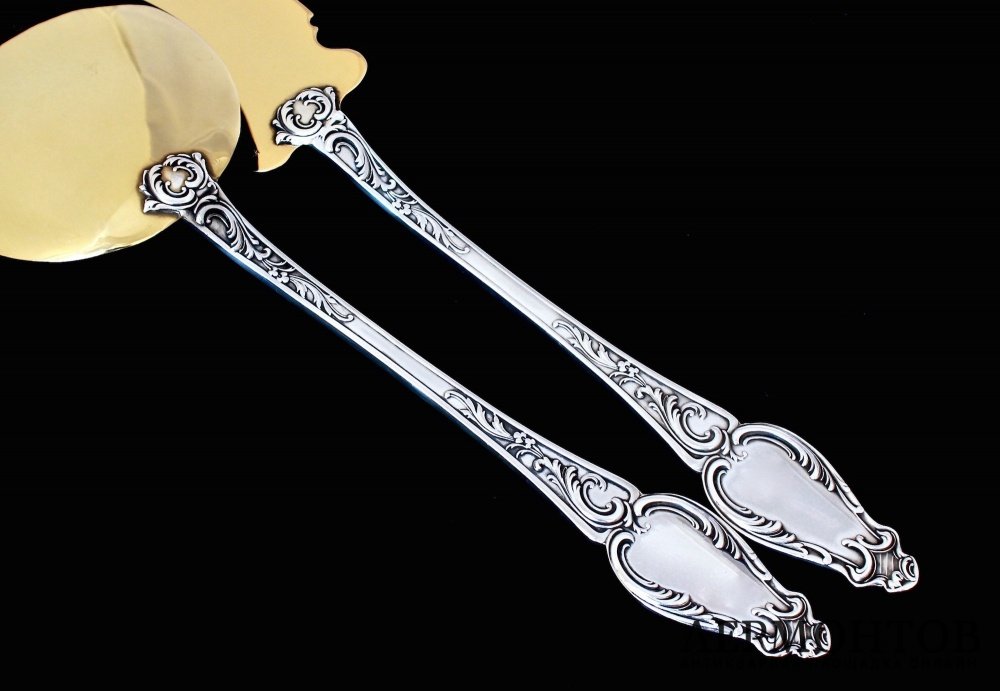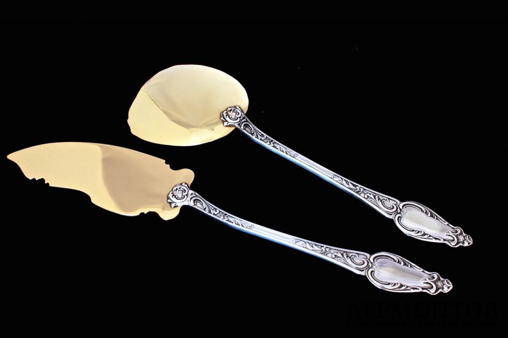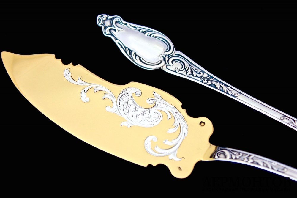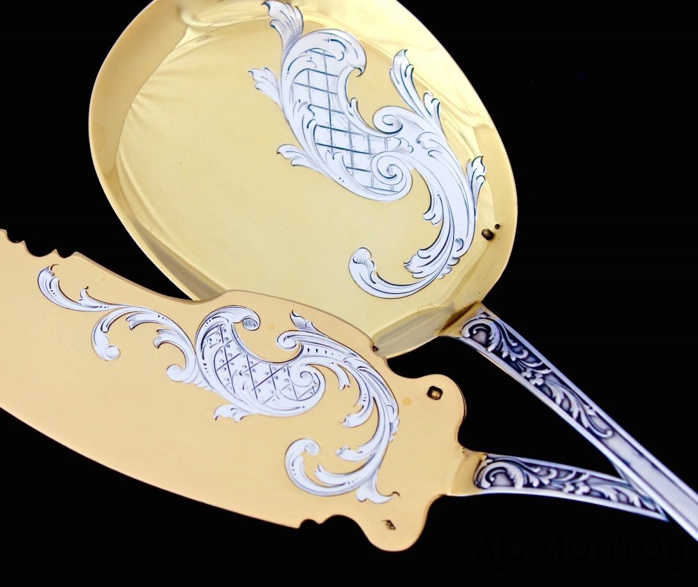 Сервировочный набор из серебра 950 пробы с применением техники декоративного золочения и художественной резьбы по металлу Франция, 19 век Длина приборов 23,5-26,5 см Общий вес серебра 165 гр Клеймо "голова Минервы 1", клеймо "голова Меркурия 1", клеймо знаменитого мастера Henri Soufflot 1884-1910 гг. Отличное состояние