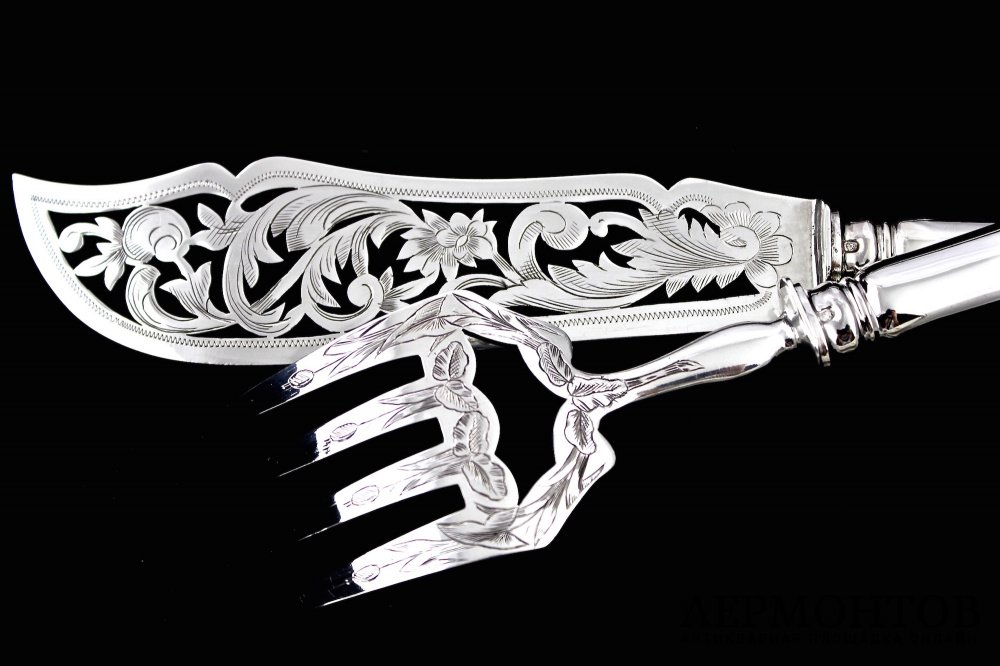 Сервировочный комплект для салата. E. Ernie. Серебро 950 пробы, кость. Франция, XIX в