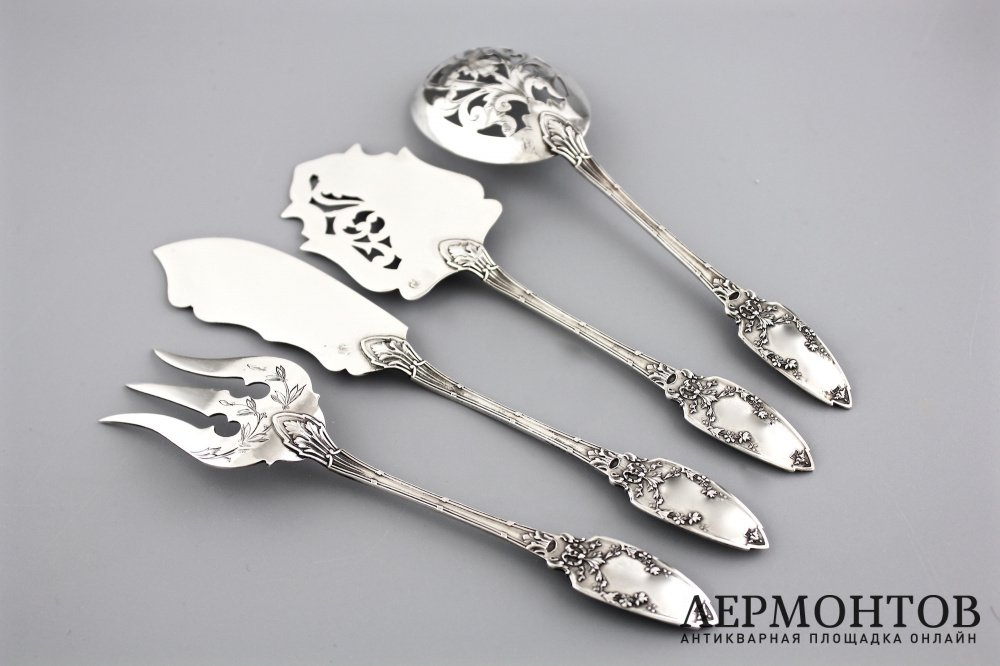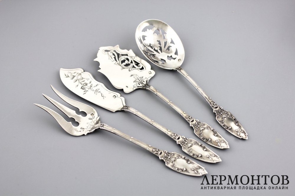 Серебряный сервировочный набор для закусок. Украшен изящным растительным орнаментом