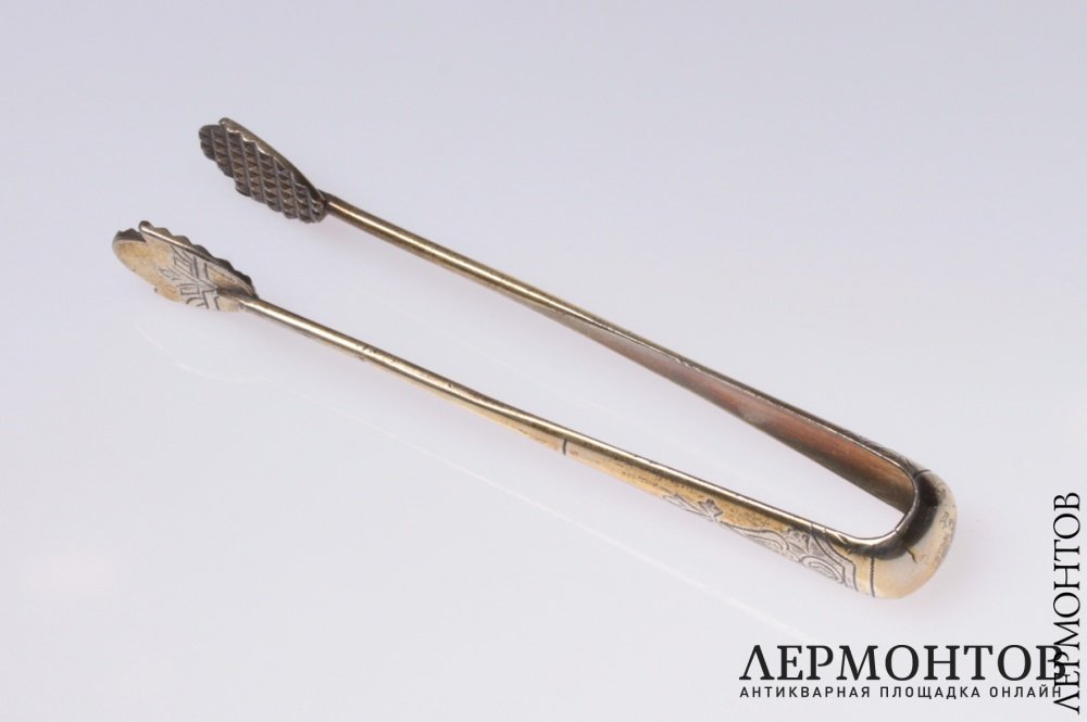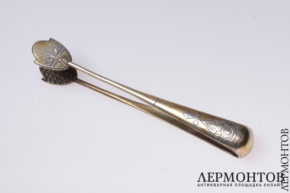 Щипцы для сахара, изготовленные из серебра 84 пробы в Москве в период между 1899 и 1908 годами. Есть трещина.