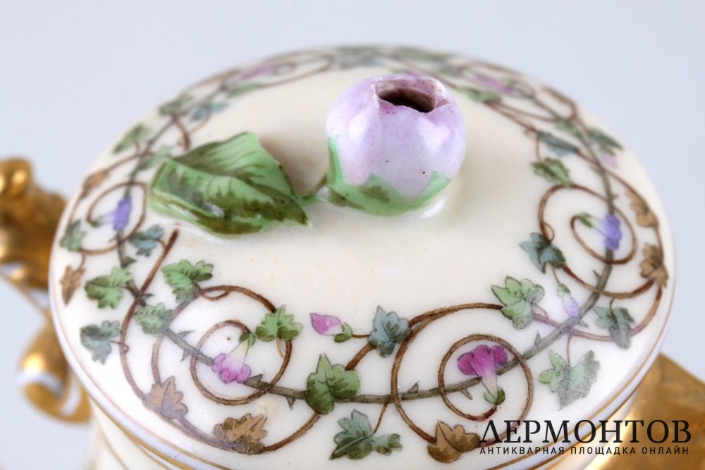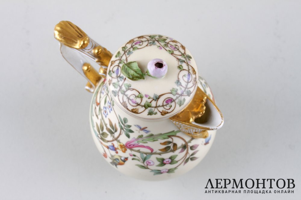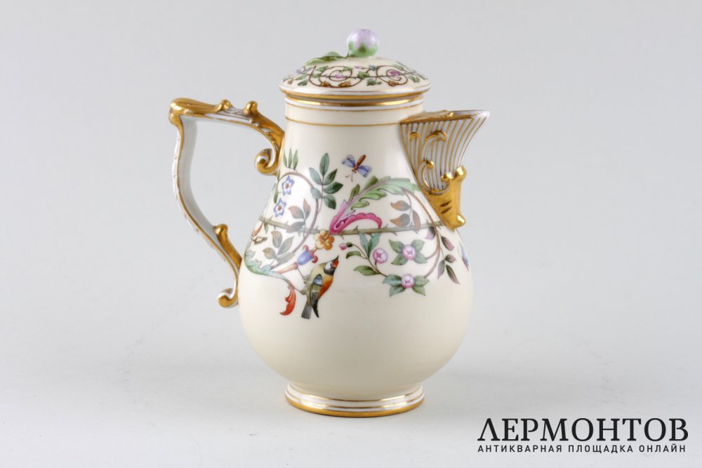 Антикварный фарфоровый сливочник в классическом стиле. Изготовлен на Императорском фарфоровом заводе во второй половине XIX века. Украшен живописной росписью с флоральным орнаментом, птицами и бабочками. Сохранен в отличном состоянии без реставраций.