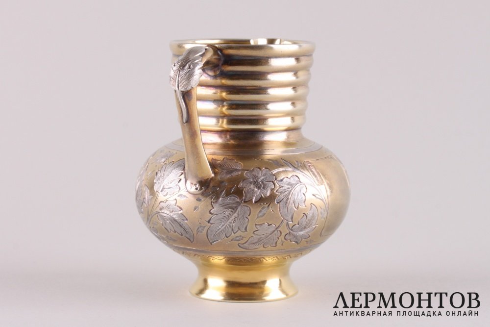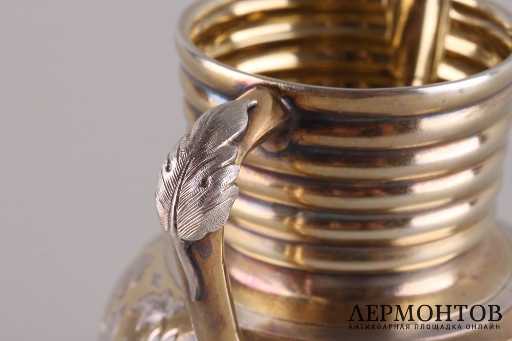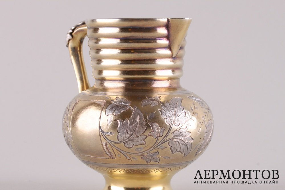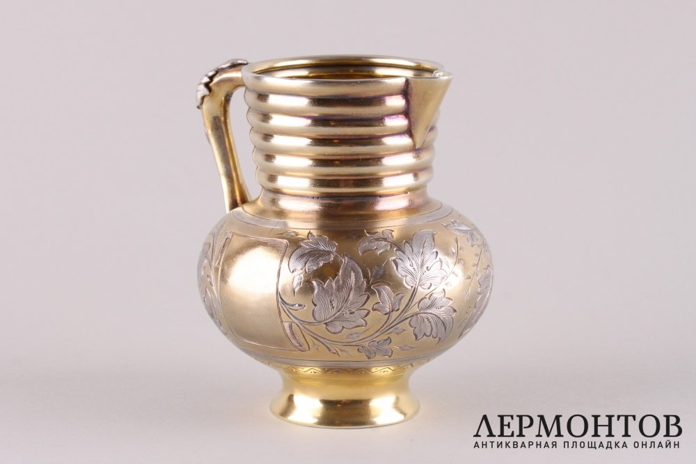 Антикварный сливочник, изготовленный из серебра 84 пробы в русском стиле в мастерской Федора Ярцева в Москве в 1885 году. Стилизован под квасник с характерным для русского стиля орнаментом. Сохранен в отличном состоянии.