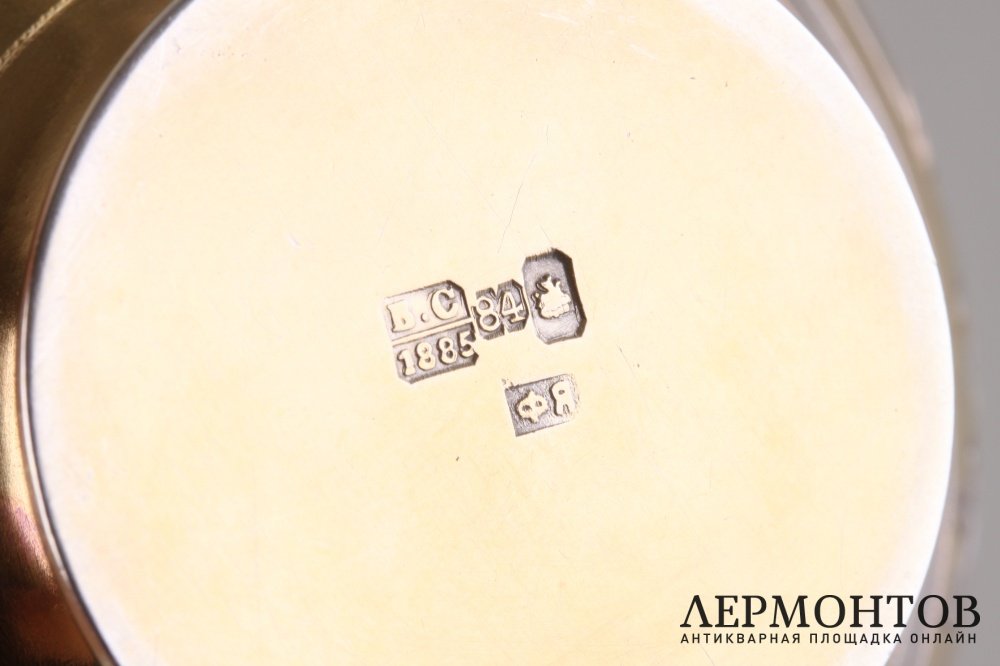 Клейма: тройник - годовое клеймо "1885" с инициалами пробирного инспектора Виктора Савинкова; цифровое обозначение пробы "84", "всадник с копьем" - клеймо Московского пробирного управления. Именник мастерской "ФЯ".