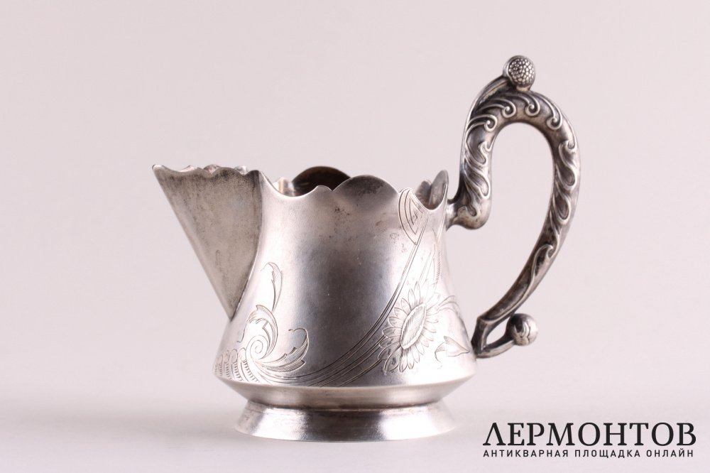 Антикварный сливочник из серебра 84 пробы, изготовленный в Москве в период между 1908 и 1917 годами. Выполнен в стиле модерн, украшен характерным орнаментом.