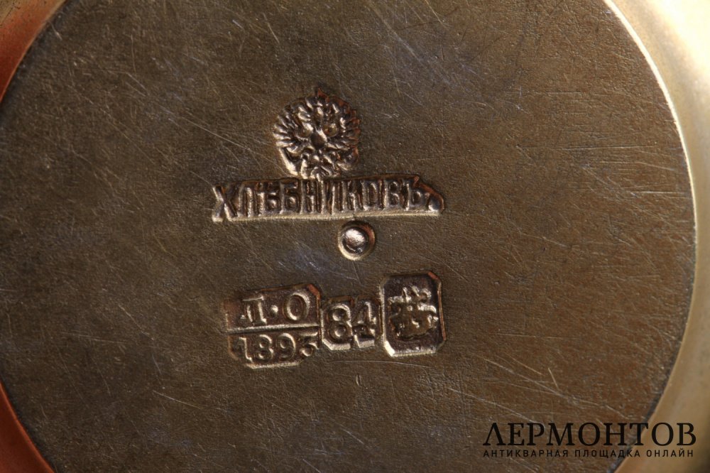 Обращаем ваше внимание на то, что изделие выполнено из серебра 84 пробы, о чем свидетельствуют клейма и экспертная оценка. Клейма: пробирного мастера "ЛО" с годовым клеймом "1893"; цифровое обозначение пробы "84"; городское клеймо Москвы - "Всадник"; развернутое клеймо "Хлебниковъ" под двуглавым орлом.