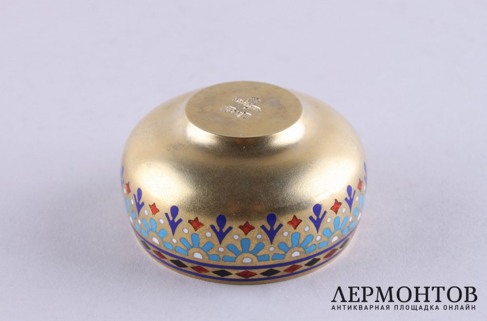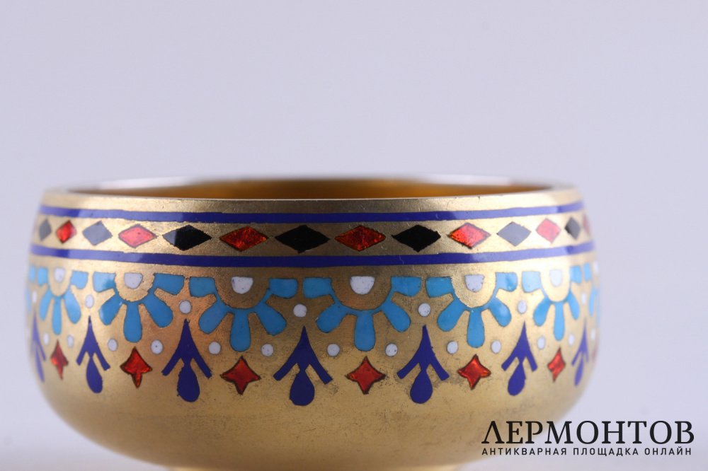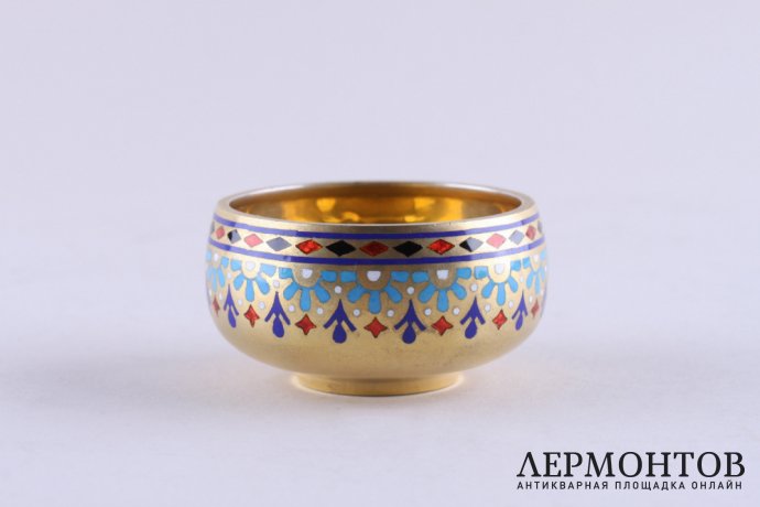 Антикварная солонка из серебра 84 пробы, изготовленная в Российской империи в Москве в мастерской поставщика императорского двора Ивана Хлебников в 1893 году. Изделие украшено полихромной выемчатой эмалью и покрыто золочением.