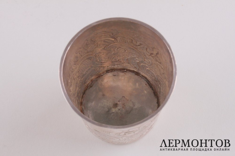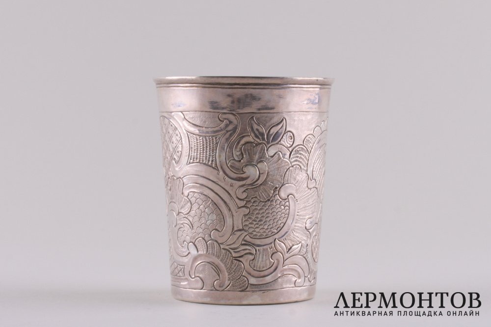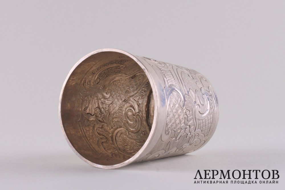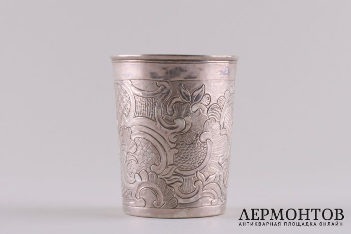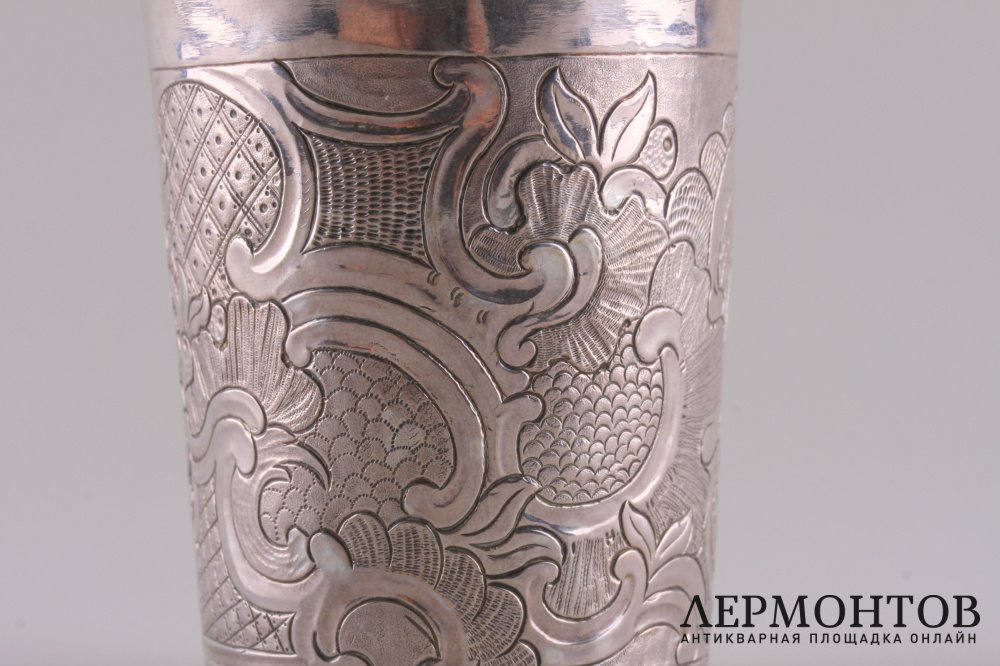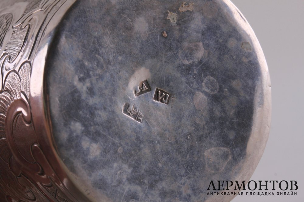Антикварный руссий серебряный стакан, изготовленный в Москве в 1754 году. Украшен рокайльным орнаментом.