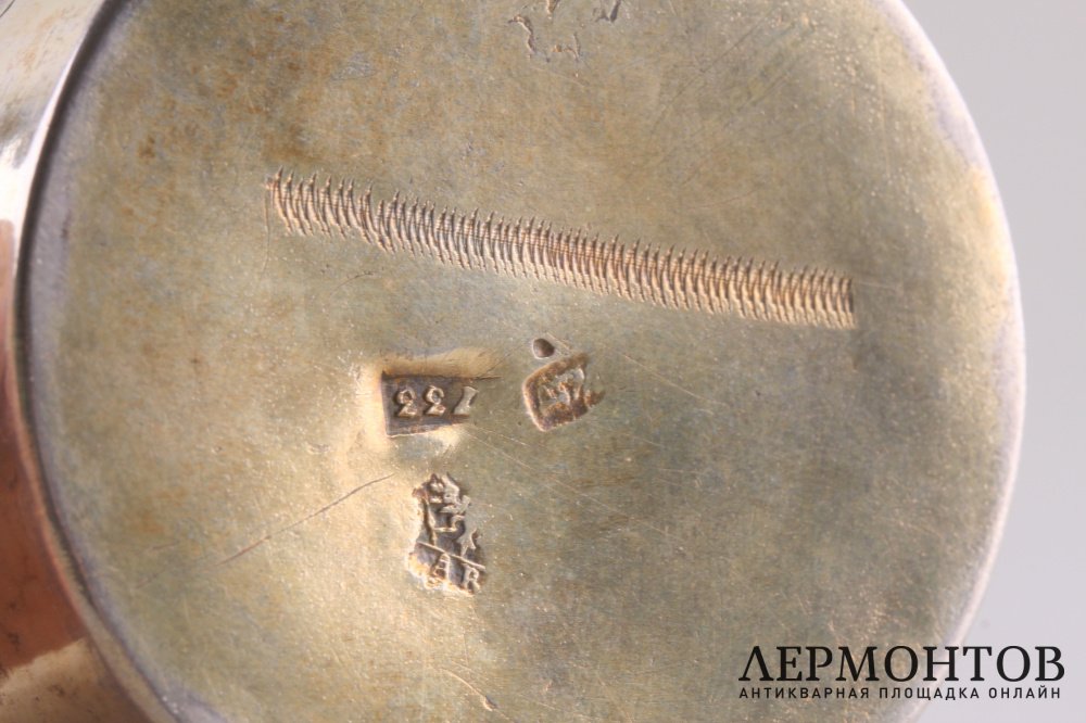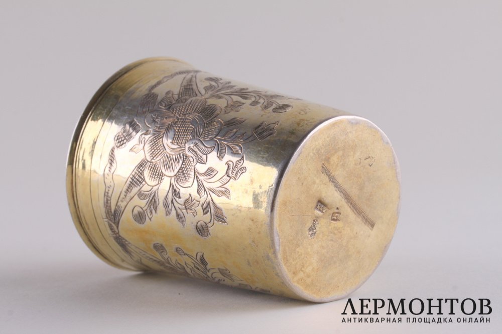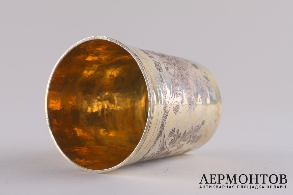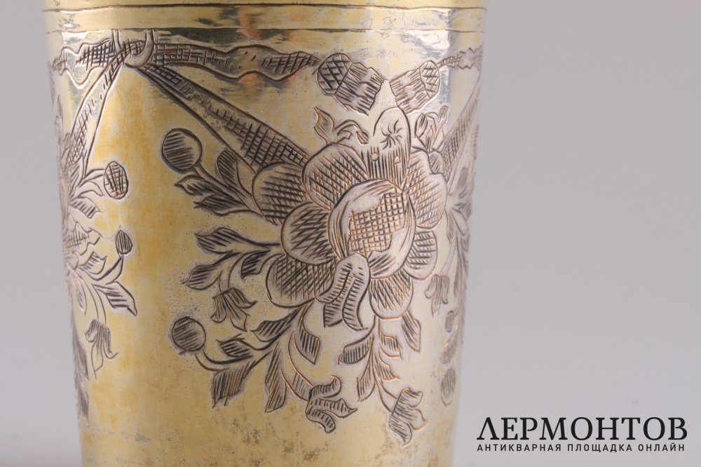 Антикварный серебряный стакан, изготовленный в Москве в 1733 году. Украшен штихельной резьбой с орнаментом в виде цветочных гирлянд.