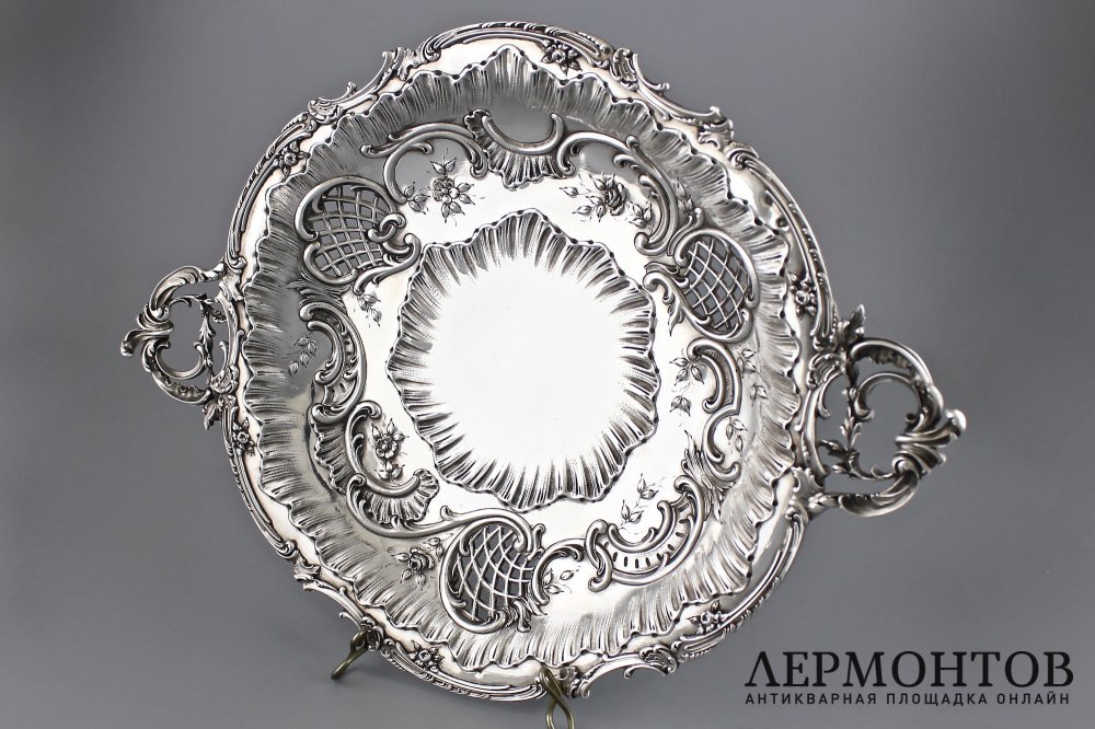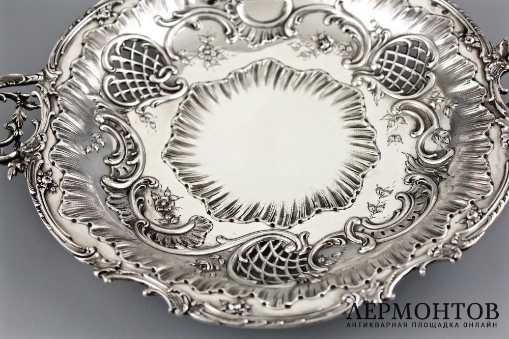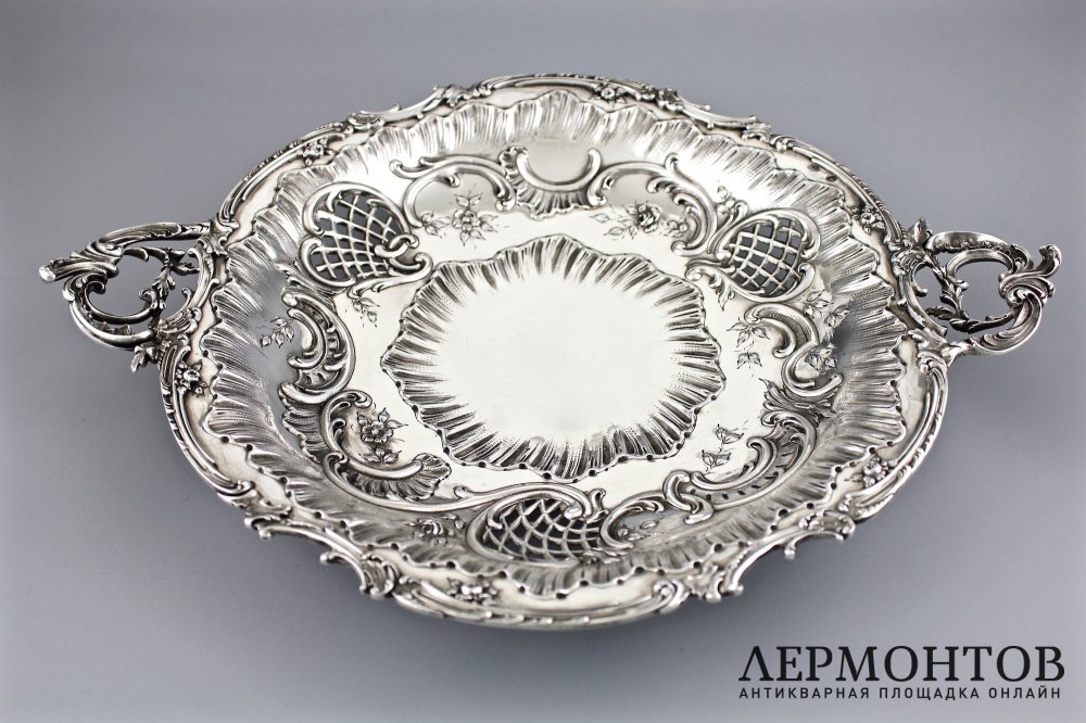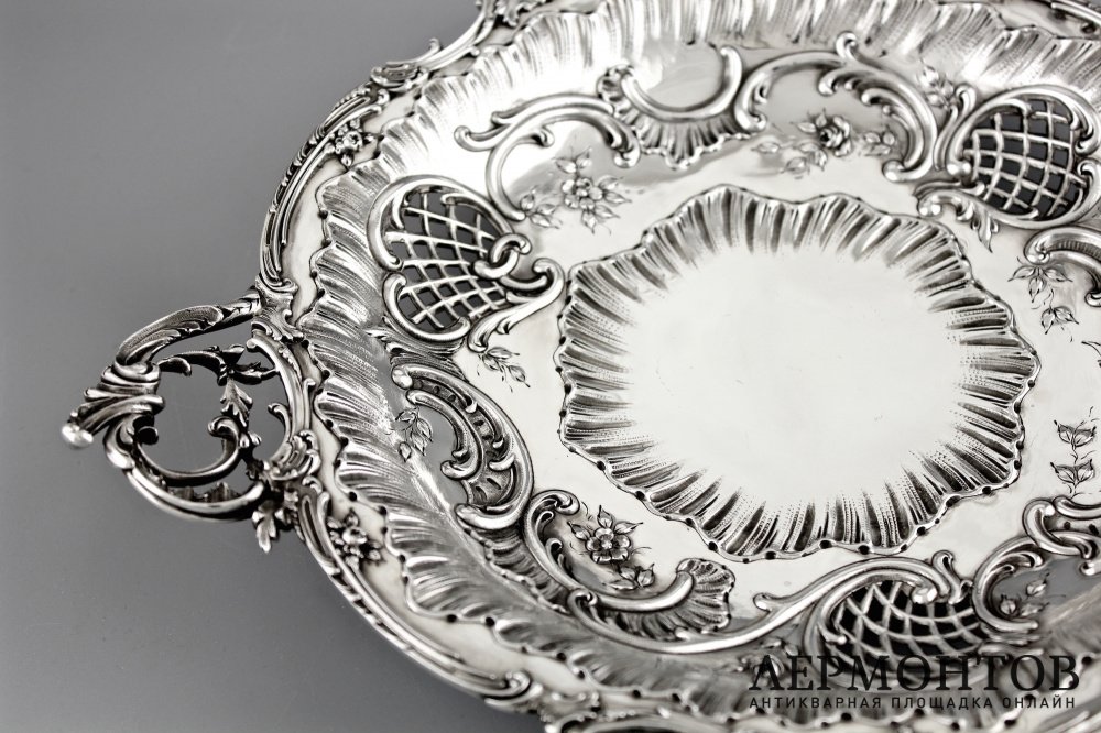 Антикварная сухарница, богато украшенная резным декором, кружевными завитками рокайля и миниатюрными цветами. Рукояти и ножки выполнены в форме закрученных веточек и листьев аканта. Сохранена в отличном состоянии.